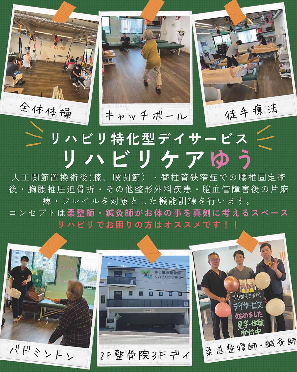 「リハビリケアゆう」は、ゆう鍼灸整骨院併設の半日運動特化型デイサービスです。「鍼灸整骨院×デイサービスのコラボレーション」として、当院3階に所在し、リハビリや運動に用いる器具を設置し、柔道整復師・鍼灸師が、お体のことを真剣に考え取り組むスペースとして開設いたしました。